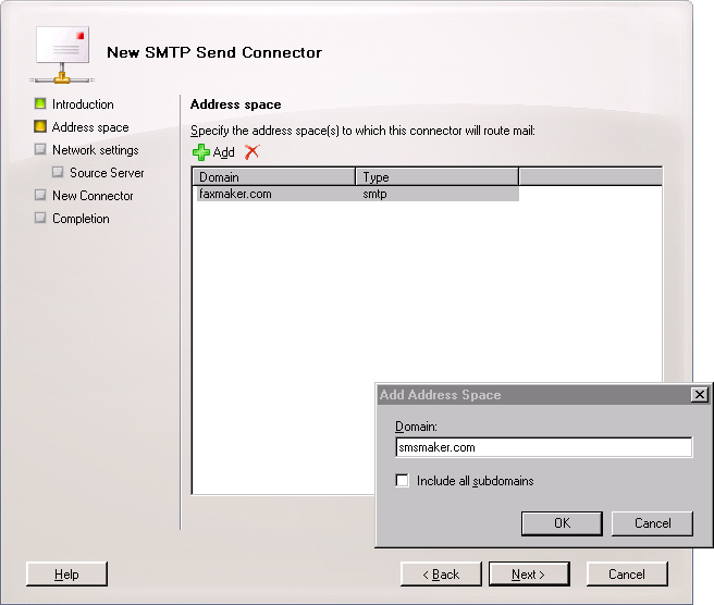 3- Bu aşamada Address space kısmındaki Add butonunu tıklatarak “faxmaker.com” ve “smsmaker.com” alan adlarımızı tanımlıyoruz.