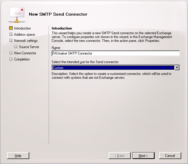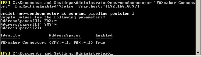 • “new-sendConnector <name of connector> -DnsRoutingEnabled:$false -Smarthosts:<IP of machine where GFI FAXmaker is installed>”