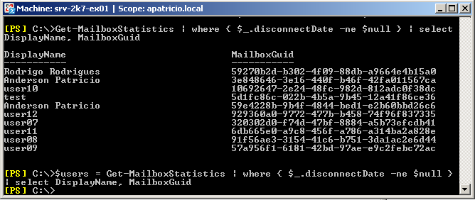 $users = Get-MailboxStatistics | where-object { $_.DisconnectDate -ne $null } | Select DisplayName,MailboxGuid